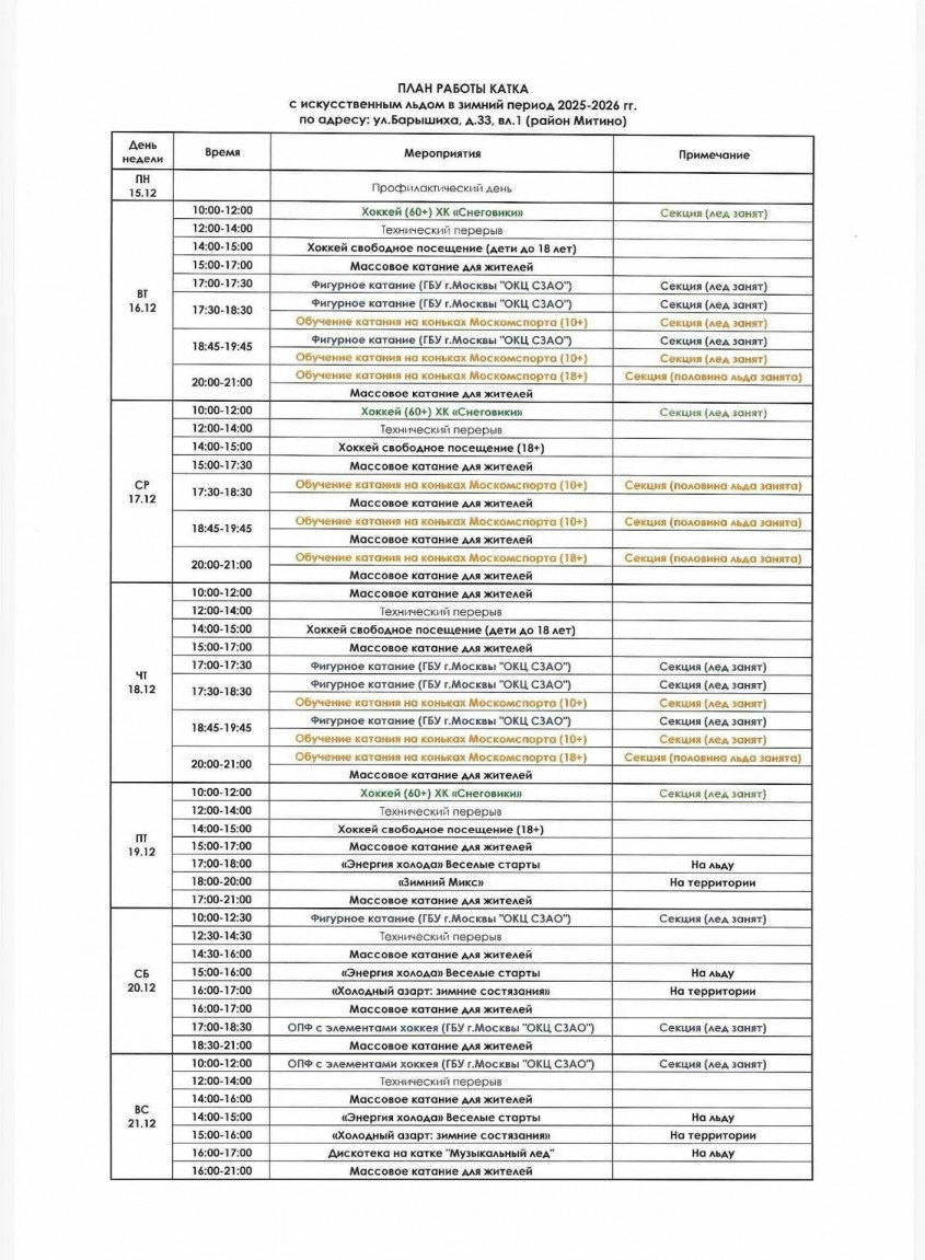 График работы катка на Барышихе с 16.12.2025 по 21.12.2025